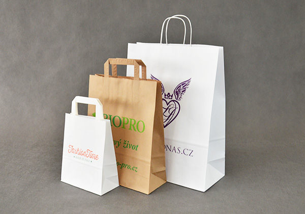 Vyrábíme strojní papírové tašky s plochým nebo krouceným uchem z kraftových papírů od 500 ks až po 10.000.000 ks. Potisk je realizován flexotiskem nebo ofsetem.